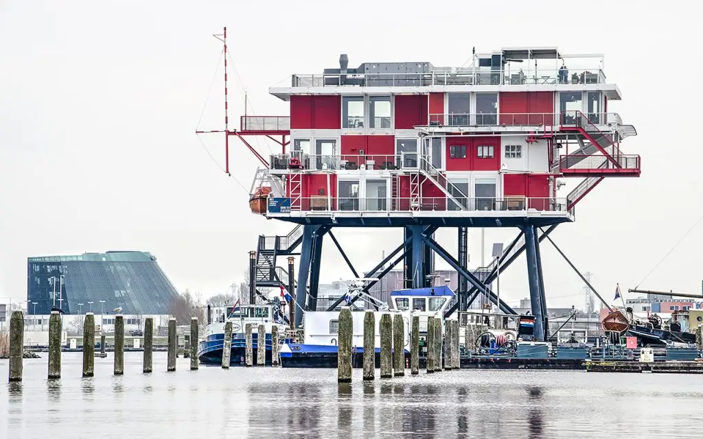 Depuis 2011, la plateforme est amarrée au milieu des Houthavens dans le nord d’Amsterdam. La Rem Eiland est depuis devenu un restaurant tout à fait atypique.
