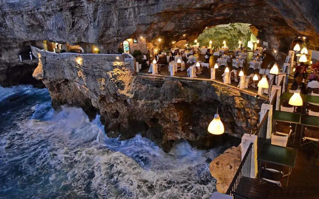 Aménagé dans une caverne naturelle à 45 mètres au dessus de la mer, le restaurant de l’hôtel Grotta Palazzese offre un spectacle fabuleux à ses clients. Le restaurant troglodyte Grotta Palazzese tire son nom de la grotte de calcaire dans lequel il est enfouit.